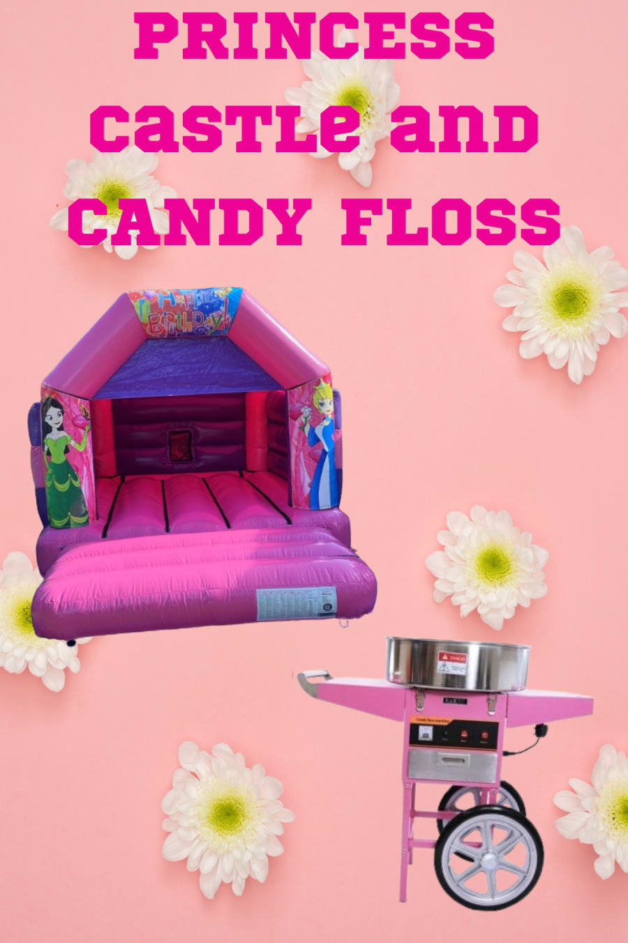 This package includes our Princess themed bouncy castle and our candy floss machine which comes with 50 sticks (We can supply more at an extra cost) and 1.47kg of candy floss.